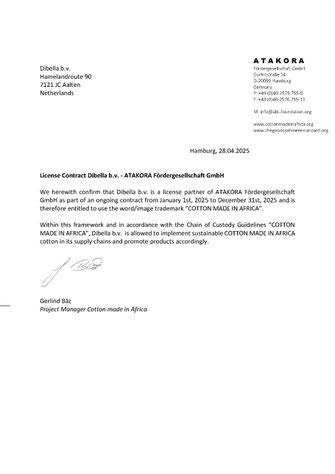 Dibella is proud of its partnership with the Cotton made in Africa (CmiA) initiative, an internationally recognised internationally recognised standard for sustainable cotton grown by small African farmers. grown by African smallholders. CmiA-verified cotton has a significantly lower impact on the environment on the environment than conventional cotton and supports village communities in Africa.